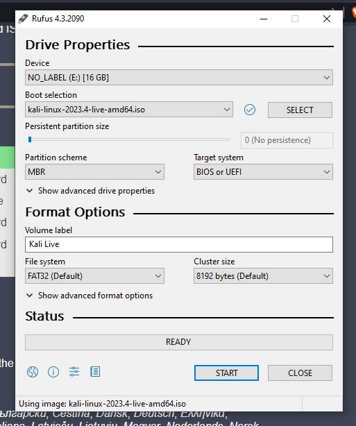 Click the SELECT button and select the Kali image you downloaded earlier. It should be something like kali-linux-2023.4-live-amd64.iso