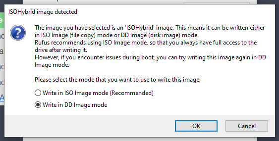 Step 7: Click start. You will be prompted to select the write mode. I almost always select DD mode. If you want to use ISO mode you will be able to use the USB drive more like a USB drive as well but this doesn’t always work to boot from.