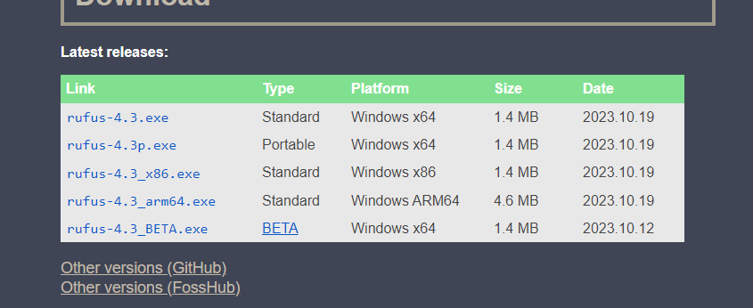 Go to https://rufus.ie/en/ and scroll part way down the page to the download section and select your option. Probably the first one. In this case rufus-4.3.ext