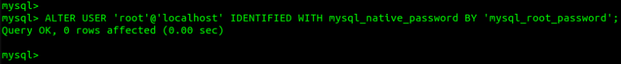 mysql> ALTER USER ‘root’@’localhost’ IDENTIFIED WITH mysql_native_password BY ‘mysql_root_password’;