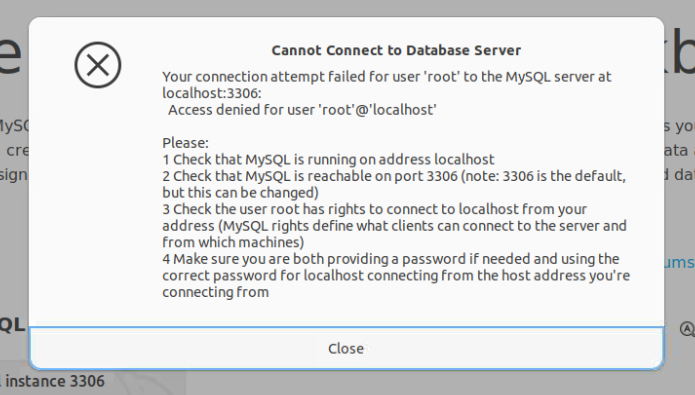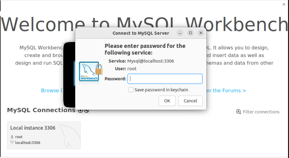Now we can open MySQL Workbench again and click on Local instance 3306 and we are greeted with a password prompt.