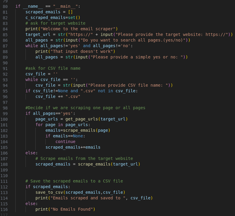 This section of the code asks the user for some input. This input consists of the target website, if the program is going to look for emails on just the first page or if it will also look for emails on any page linked to that page. The name of the final CSV file is also input by the user here. The program then uses this information to make decisions on how and when to use the above functions to produce the desired file containing the list of emails. If there are not emails found the program will tell you that no emails where found and exit.