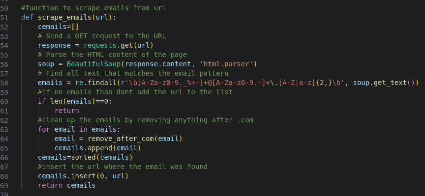 This function takes the list of URLs from the first function and creates a list of emails from the websites. It then uses the second function to clean any leftover text from the end of the emails.