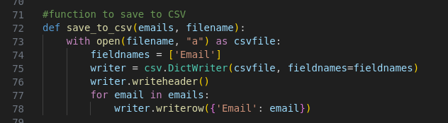 This function is used to write the list of emails to a CSV file. This program can be run on multiple websites and have the results sent to the same CSV file. The program will simply just add the new results onto the end of the file resulting in a larger file of emails.