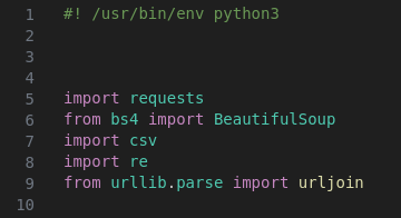 Now that I have provided some basics to the python syntax lets look at the web scraper. This scraper was written to create a CSV file of emails found on a target website. We start a shebang and importing the modules we will be using. The shebang will tell the computer that the following code needs to be executed using the python3 interpreter and the modules will provide us with the functions we will be using in the web scraper.